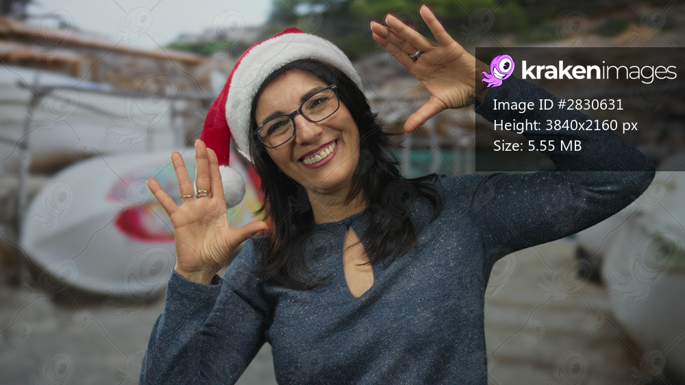 Woman wearing a red santa hat frames her face with her hands and smiles while wearing glasses in studio; holiday cheer.