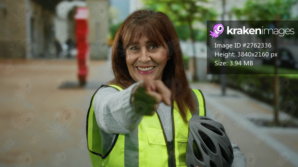 Woman wearing a safety vest holds a bike helmet on a city street, winking and pointing, surrounded by blurred urban landscape and trees on a sunny day. - Kraken Images