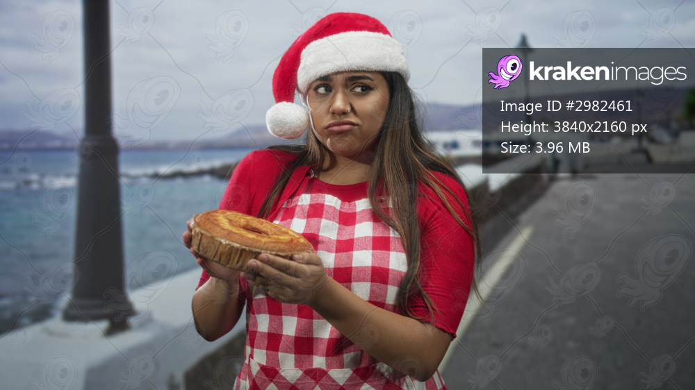 Woman wearing a santa hat and checkered apron holds a sponge cake with both hands and pouts on a street; holiday frustration.