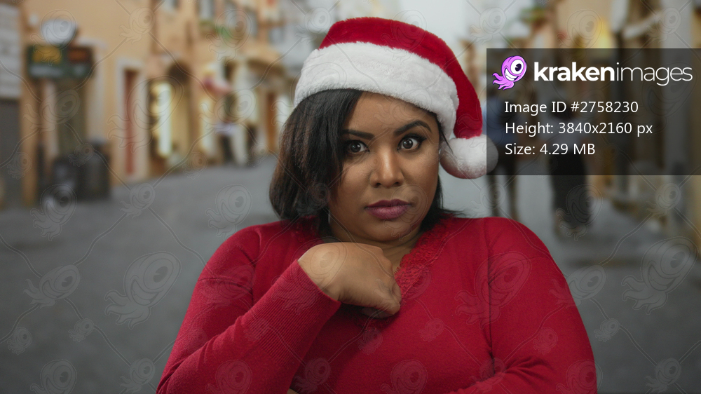 Woman wearing a santa hat gestures confidently on a festive city street, embracing her plus size identity during the holiday outdoor scene.