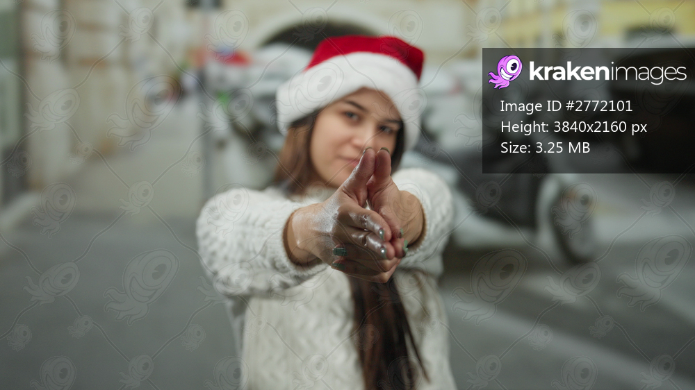 Woman wearing a santa hat points fingers playfully in a festive gesture on a bustling street showcasing holiday spirit and urban vibe outdoors.