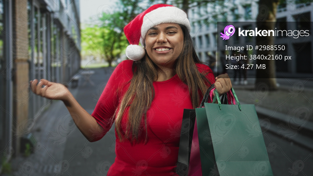 Woman wearing a santa hat and red top, holding shopping bags with her hand and smiling on a city street; holiday joy.