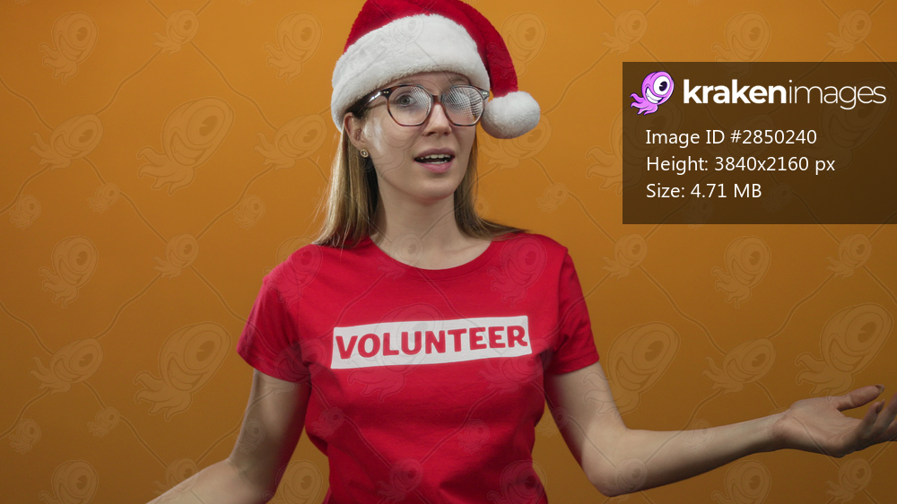 Woman wearing a santa hat and red volunteer shirt holds open arms against orange backdrop in studio; festive generosity.