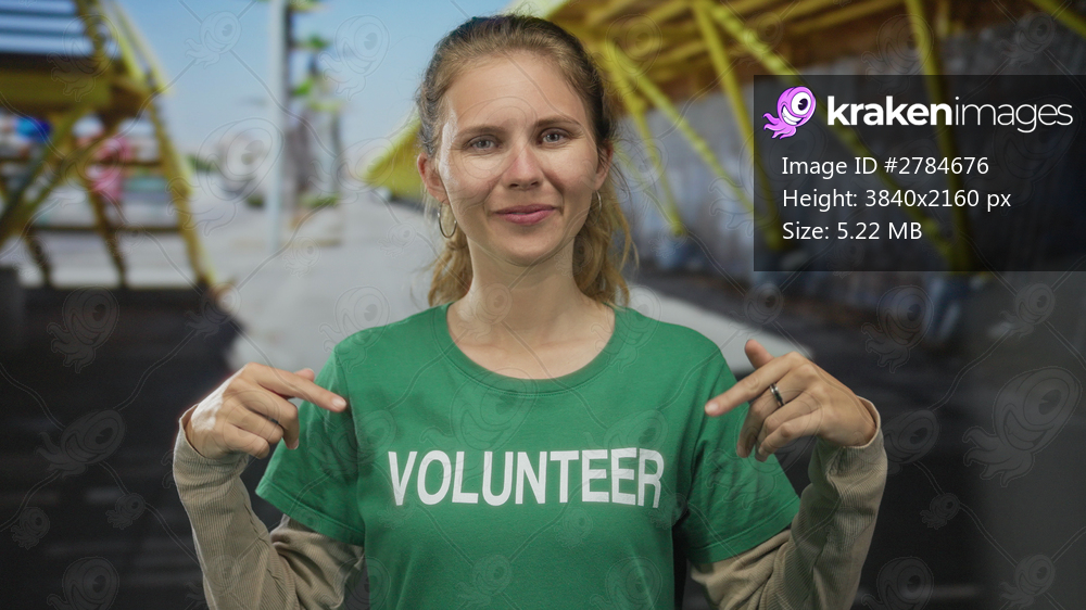 Woman wearing a shirt is pointing in a studio at volunteer blonde young wearing a tshirt and green earring.