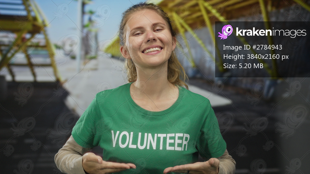 Woman wearing a shirt is pointing in a studio at volunteer blonde young wearing a tshirt and green earring.