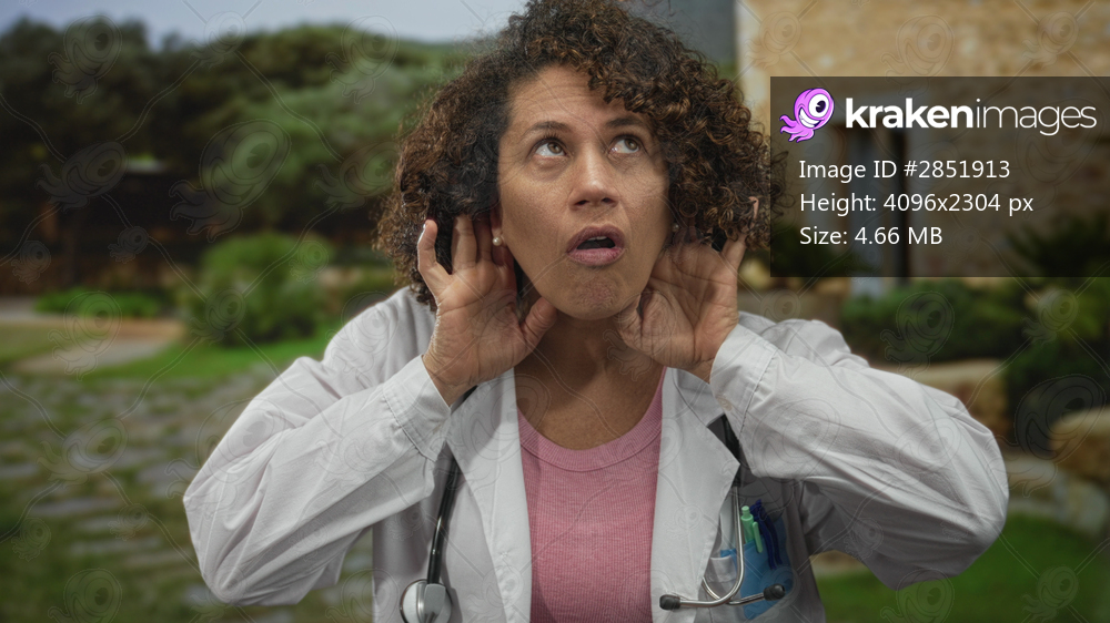 Woman wearing a stethoscope and white coat cups ear at building entrance outdoors on pathway; alertness awareness vigilance perception.