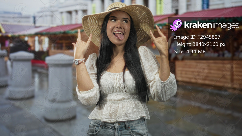 Woman wearing a straw hat showing tongue and rock horns hand gesture in a wet street market with wooden stalls and stone bollards visible; playful joy spontaneity. - Kraken Images