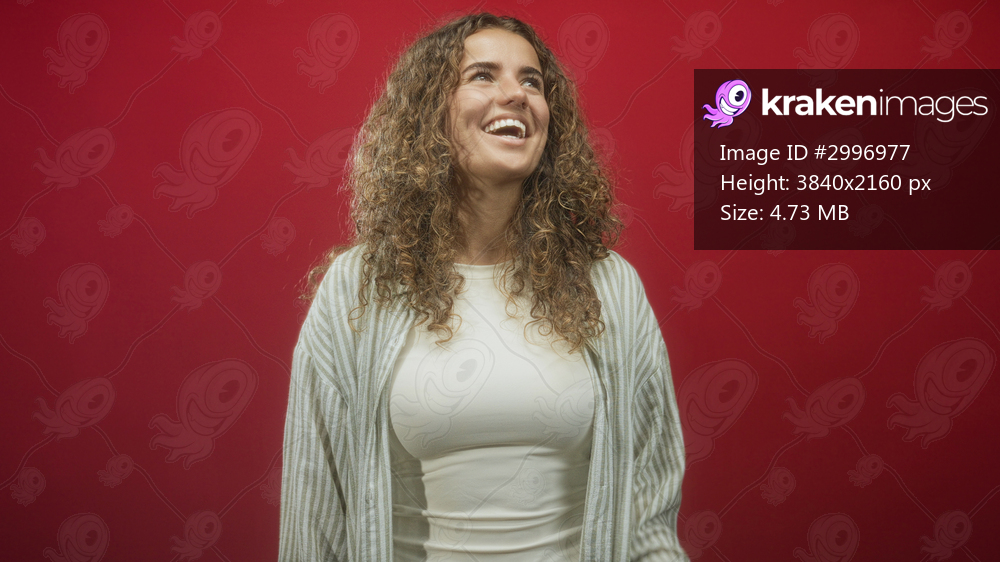 Woman wearing a striped cardigan smiles and touches her hair while laughing against a red studio backdrop; joyful confidence.