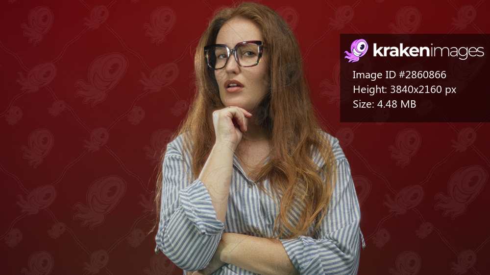 Woman wearing a striped cotton shirt with glasses rests hand on chin in studio; thoughtful introspection.
