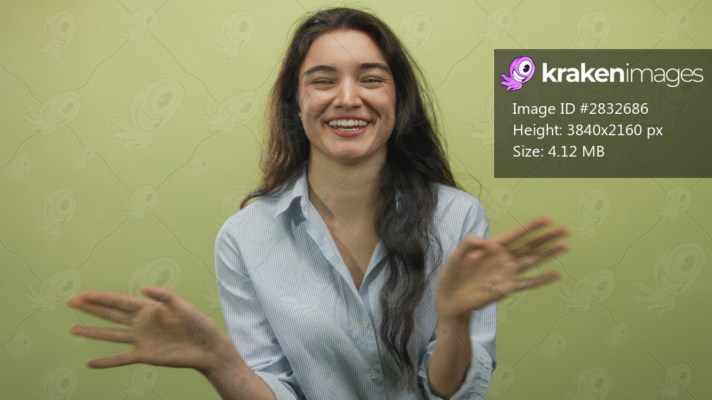 Woman wearing a striped shirt crossing her hands in x shape and laughing in front of a green wall in a studio; joy.