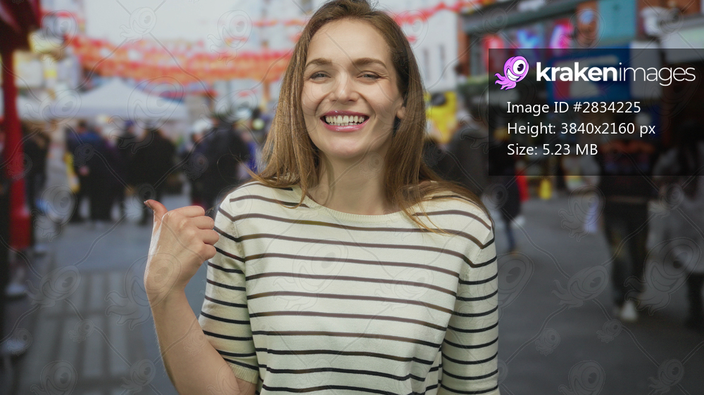 Woman wearing a striped sweater giving a thumbs up gesture in a crowded city street market with blurred pedestrians walking by; approval.