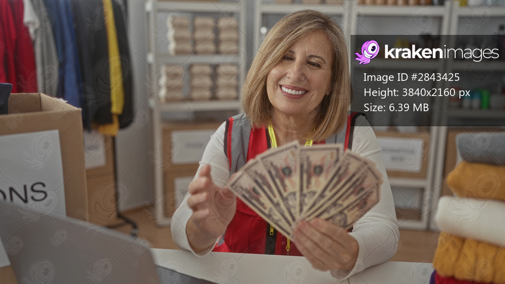 Woman wearing a volunteer vest holds banknotes in donation center building; charity compassion generosity.