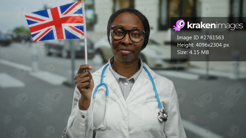 Woman wearing a white coat holding a british flag on an urban street with blurred buildings, stethoscope visible, expressing diversity in a multicultural city setting. - Kraken Images