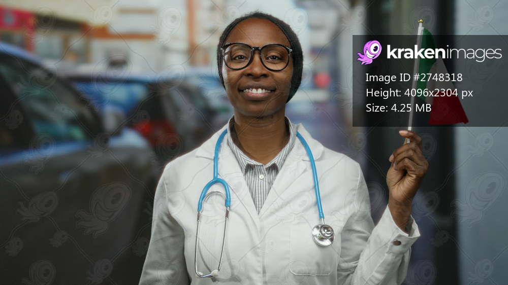 Woman wearing a white coat holds an italian flag outdoors on an urban street, embodying a blend of cultures with a professional and confident demeanor. - Kraken Images