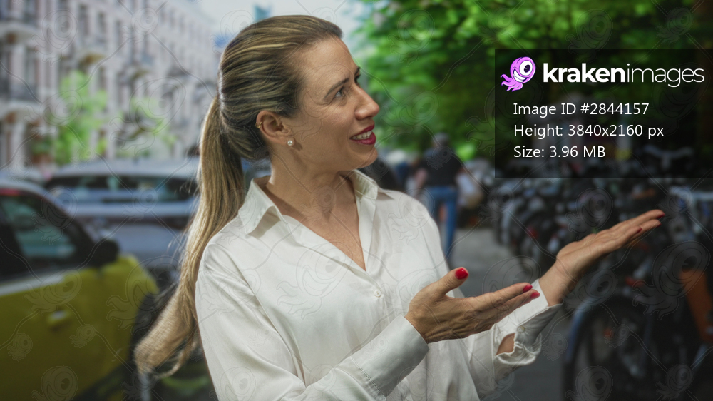 Woman wearing a white shirt gestures with open palms revealing bare hands amidst city traffic on street; openness sincerity.