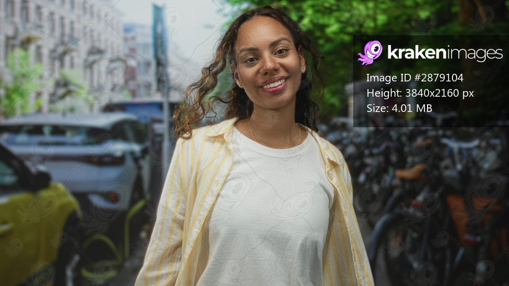 Woman wearing a white t shirt and yellow striped shirt smiling with closed eyes and tilted head on a city street; joy relaxed confidence.