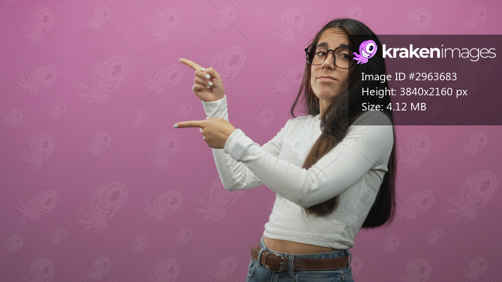 Woman wearing a white top and jeans points index fingers to left showing bare hands and glasses in studio; playful curiosity.