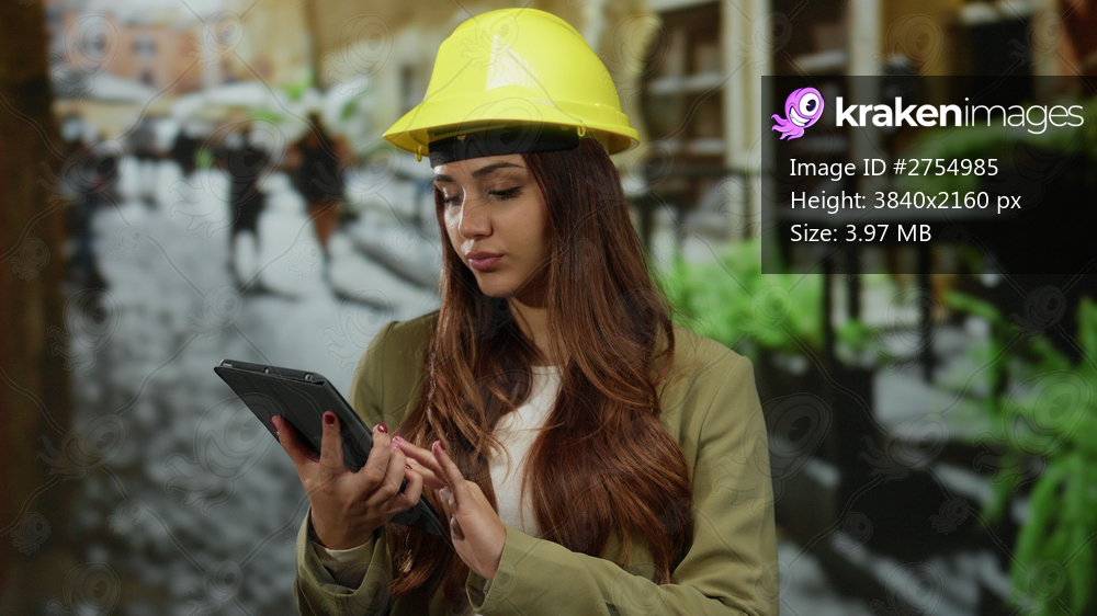 Woman wearing a yellow helmet and using a tablet, standing on an outdoor street, embodying a modern architect or engineer managing projects in an urban setting. - Kraken Images