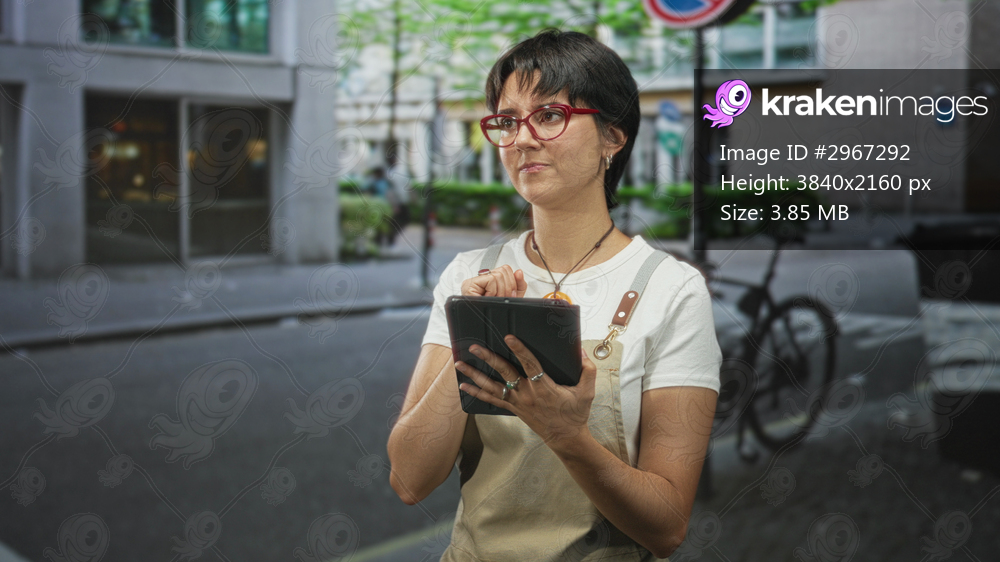Woman wearing an apron holding a tablet and touching her chin with a finger while standing on a street near a building and bicycle; contemplation planning. - Kraken Images