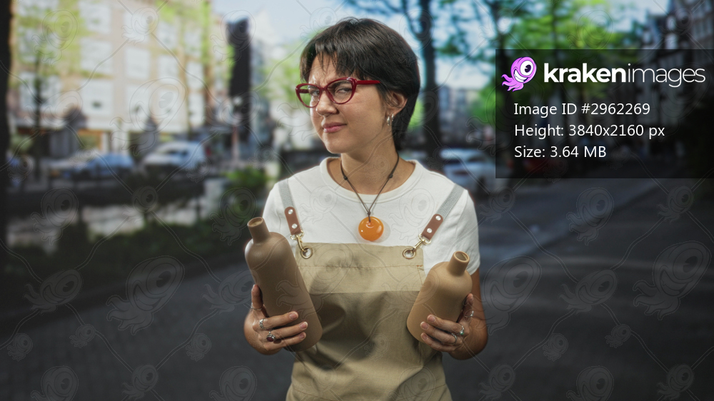 Woman wearing an apron holding two pottery bottles with hands visible on a street by a canal and buildings; artisan craft thoughtful.