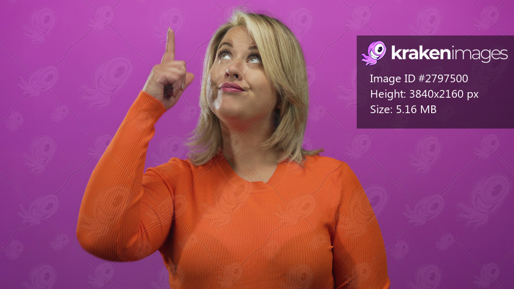 Woman wearing an orange sweater pointing finger upward in a bright purple studio setting with a cheerful smile; inspiration.