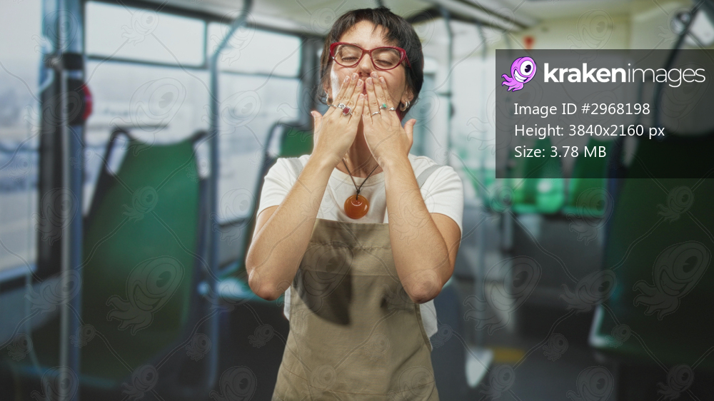 Woman wearing apron blows kisses with both hands to mouth inside a tram cabin on a street, green seats visible and pendant necklace prominent; warm playful joy. - Kraken Images