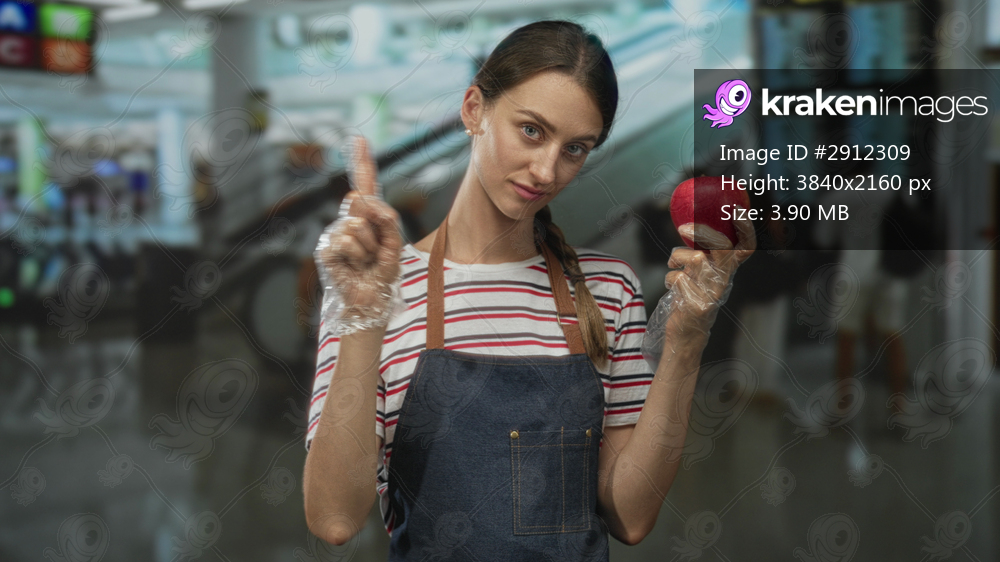 Woman wearing apron and clear gloves holding red apple and points finger up at airport terminal; hygiene confidence.