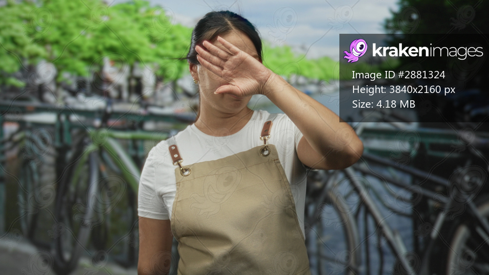 Woman wearing apron covers her eyes with hand on a street in amsterdam by canal with parked bicycles and bridge; shyness.