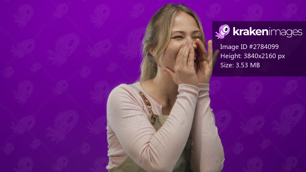 Woman wearing apron cups hands around mouth shouting in studio with purple backdrop; enthusiasm call action communication.