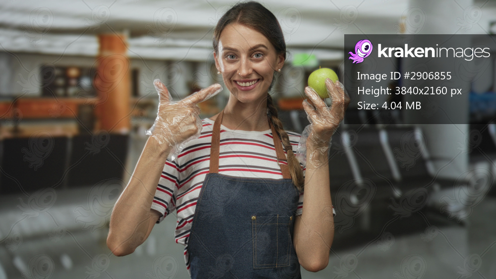 Woman wearing apron and disposable gloves pointing finger to cheek while holding green apple at airport terminal; healthy snack joy.