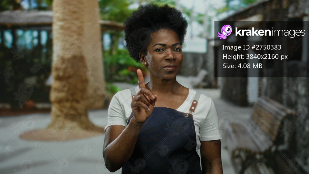 Woman wearing apron gestures no with finger on outdoor city street