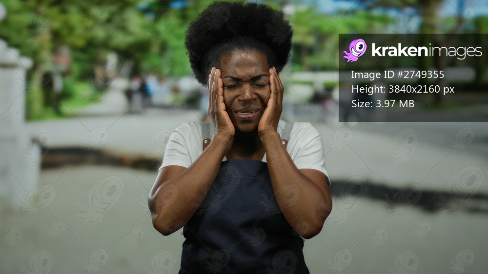 Woman wearing apron with her hands on face in outdoor city street setting conveys emotion and introspection amidst blurred background and green foliage. - Kraken Images