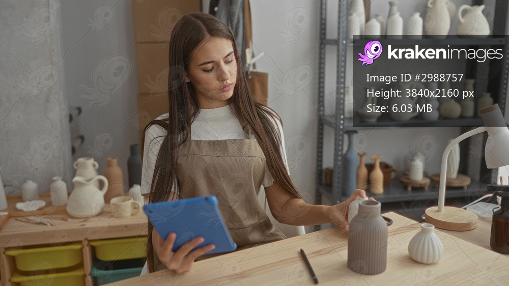 Woman wearing apron holding a blue tablet and inspecting a ceramic vase with hand on pot in pottery studio; concentration.