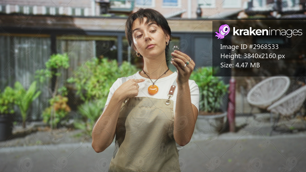Woman wearing apron holding a ring between fingers and pointing to a necklace while inspecting jewelry on a street; craft confidence.