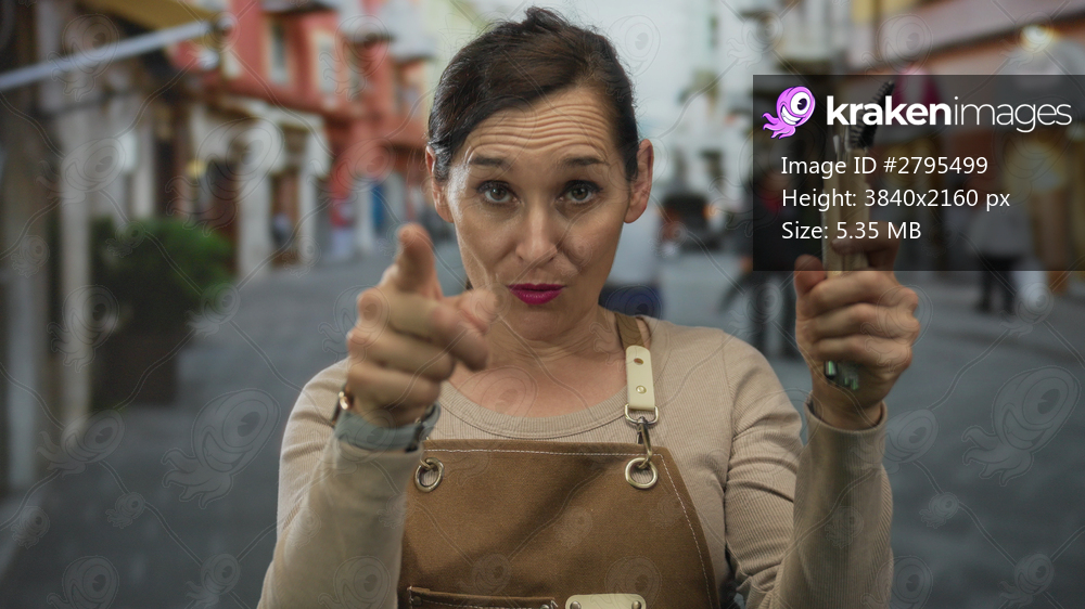 Woman wearing apron holding makeup brushes stands confidently on vibrant street reflecting urban backdrop, showcasing young dynamic vibe