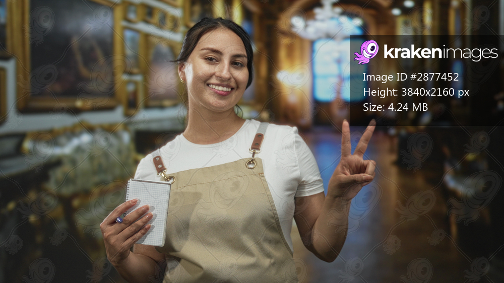 Woman wearing apron holding notepad and pen while making a peace sign in building; friendly service.