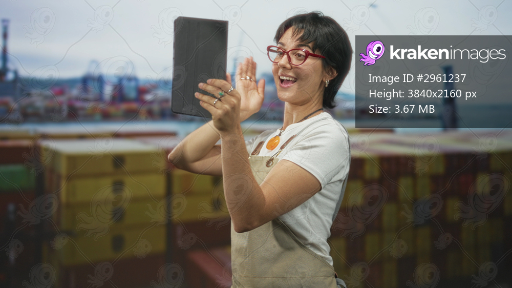 Woman wearing apron holding tablet and touching chin while looking at screen on a street with stacked containers; curiosity focus.