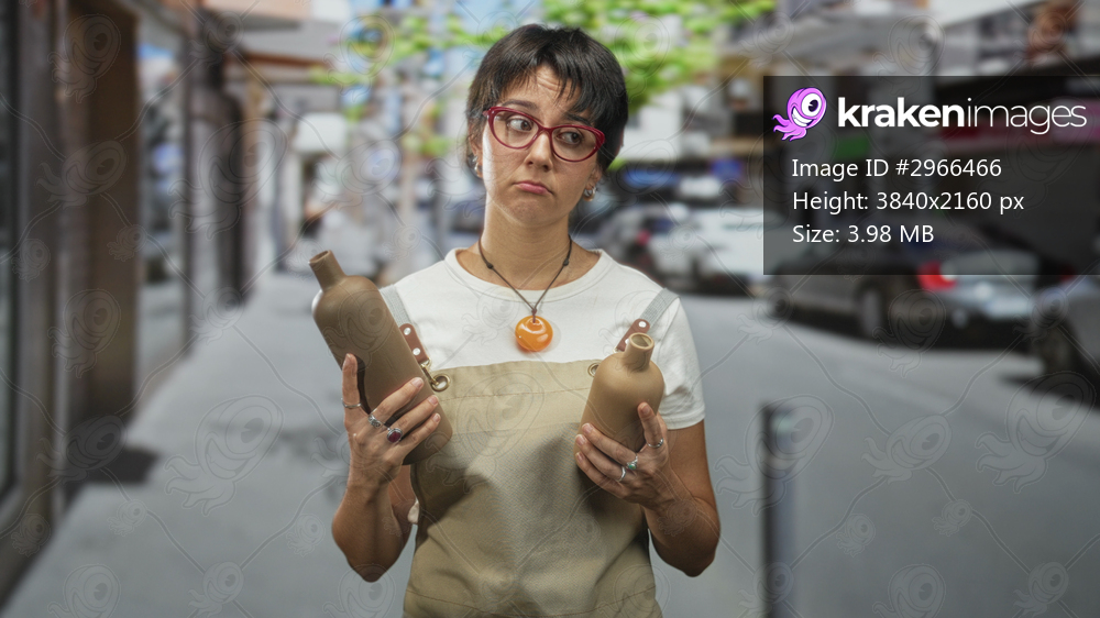 Woman wearing apron holding two pottery bottles with hands, short hair and red glasses on a street with cars, puzzled expression; uncertainty.