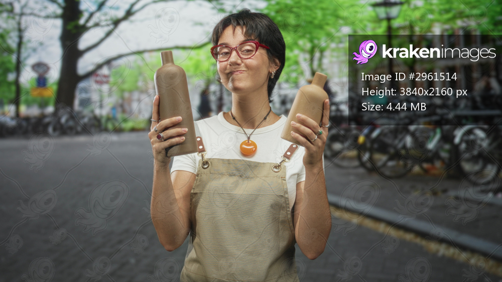 Woman wearing apron holding two pottery bottles in hands on a street with parked bicycles and trees; craft pride.