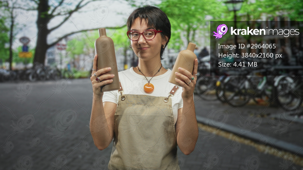 Woman wearing apron holding two pottery bottles in hands on a street with parked bicycles and trees; craft pride.