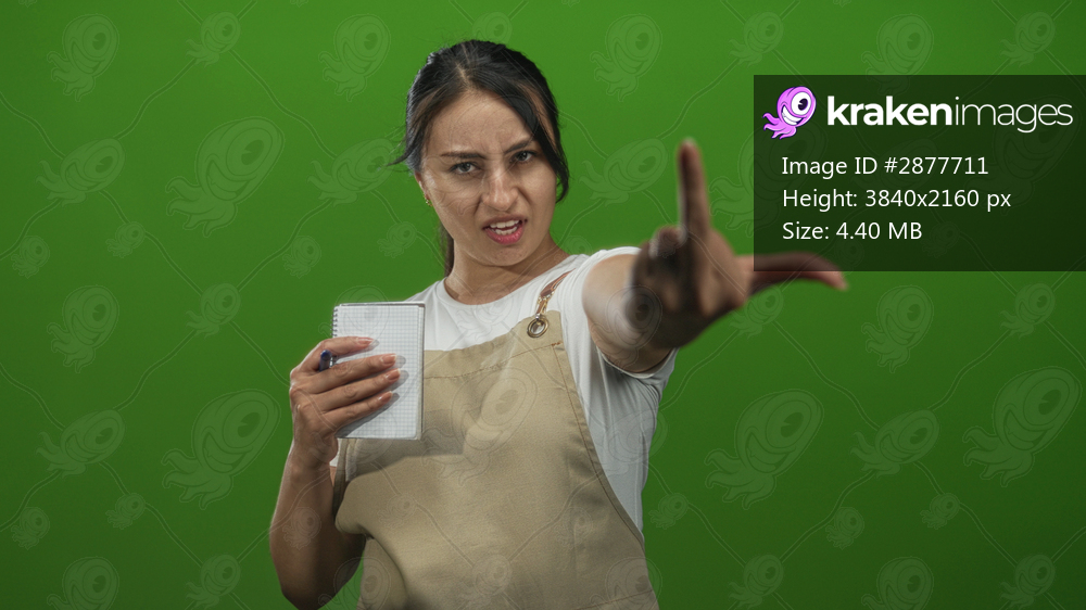 Woman wearing apron holds a notepad and shows her middle finger toward the camera in a studio with a green backdrop; defiance.