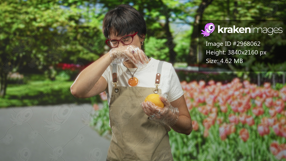 Woman wearing apron holds an orange and wipes her nose with a gloved hand in studio; concern hygiene.