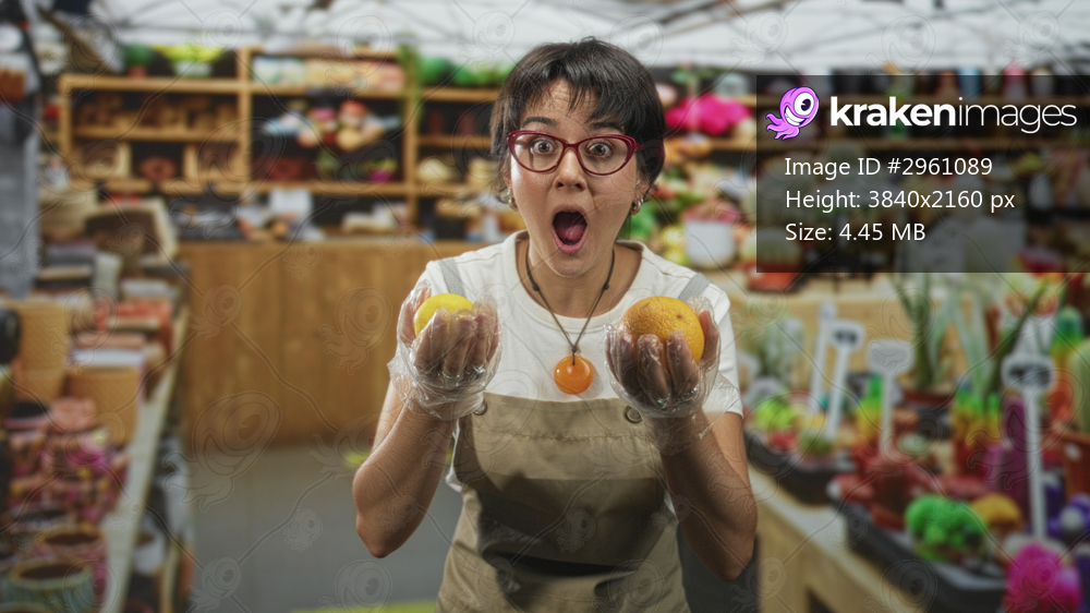 Woman wearing apron holds orange and lemon with gloved hands, mouth open inside a plant shop building; surprise curiosity.