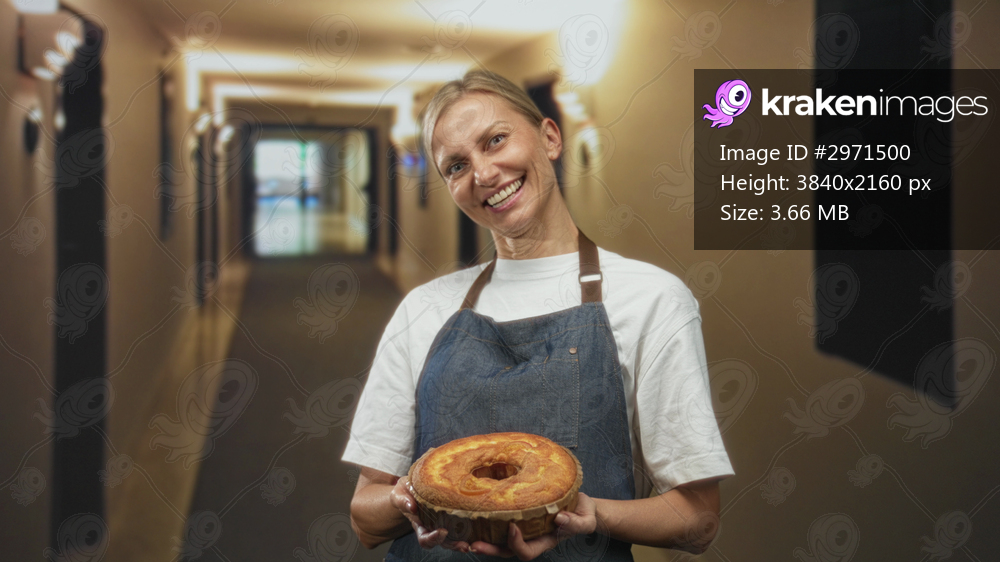 Woman wearing apron holds sponge cake with both hands in a building corridor, smiling and presenting the pastry to camera as if offering a sample; homemade pride. - Kraken Images