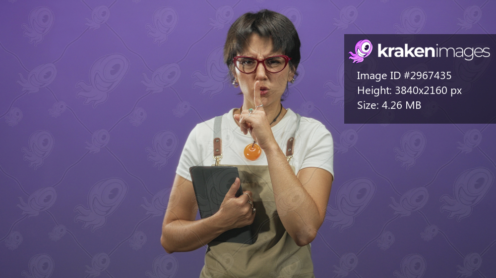 Woman wearing apron holds tablet, finger to lips for silence in studio with purple backdrop; quiet instruction.