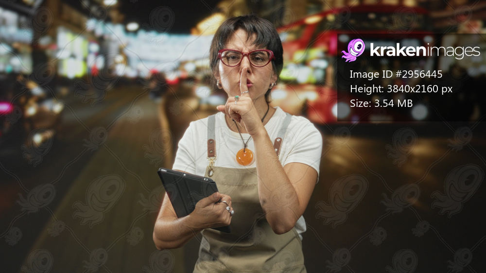 Woman wearing apron holds tablet with finger to lips for silence on a busy city street at night; silence caution.