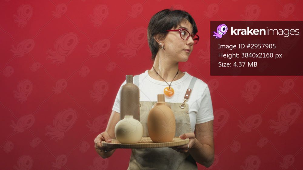 Woman wearing apron holds wooden tray of pottery vases with both hands in studio; serene craft pride.