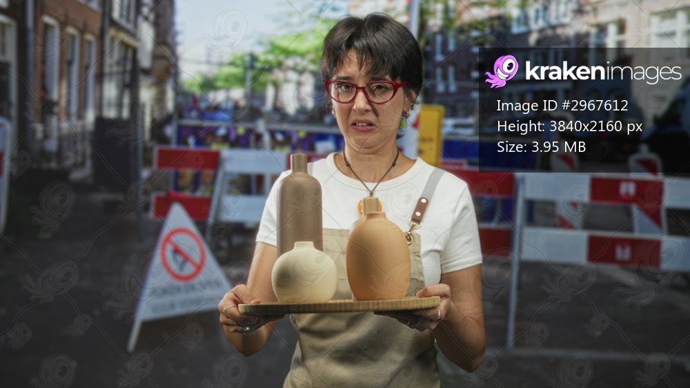 Woman wearing apron holds wooden tray with pottery vases and grimaces, nose wrinkling, on a street; disgust cautious inspection.