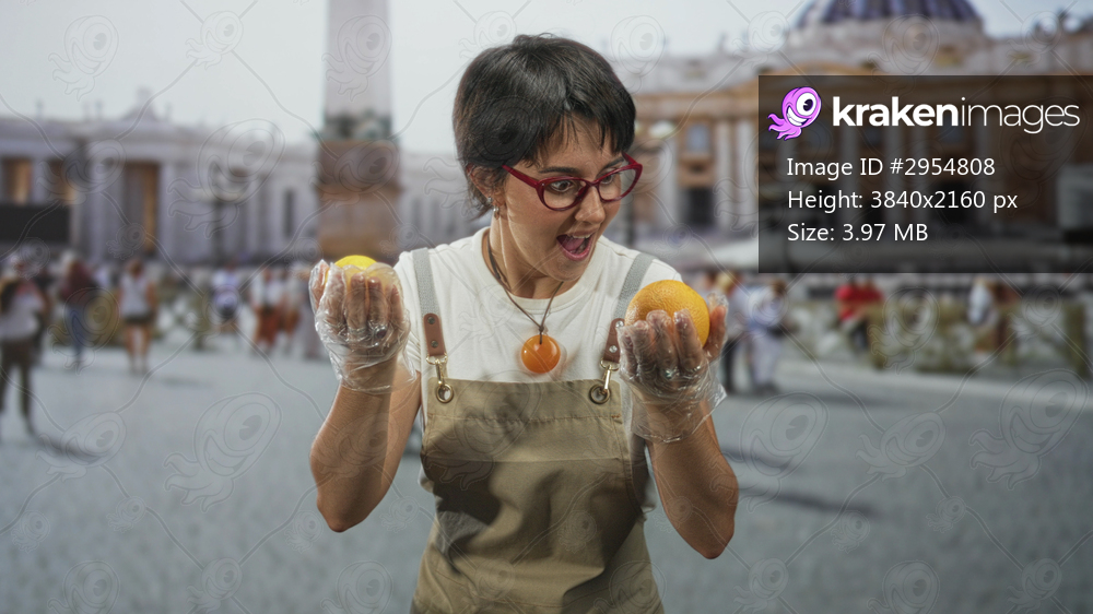 Woman wearing apron and plastic gloves holding an orange and a lemon, mouth open in surprise in building plaza; playful surprise.