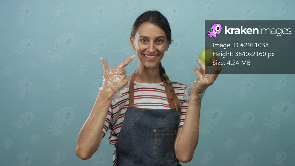 Woman wearing apron and plastic gloves holding green apple and pointing finger to cheek while smiling in blue studio; playful wellness.